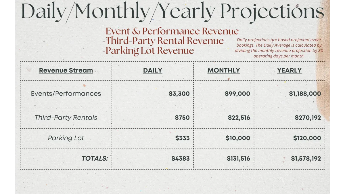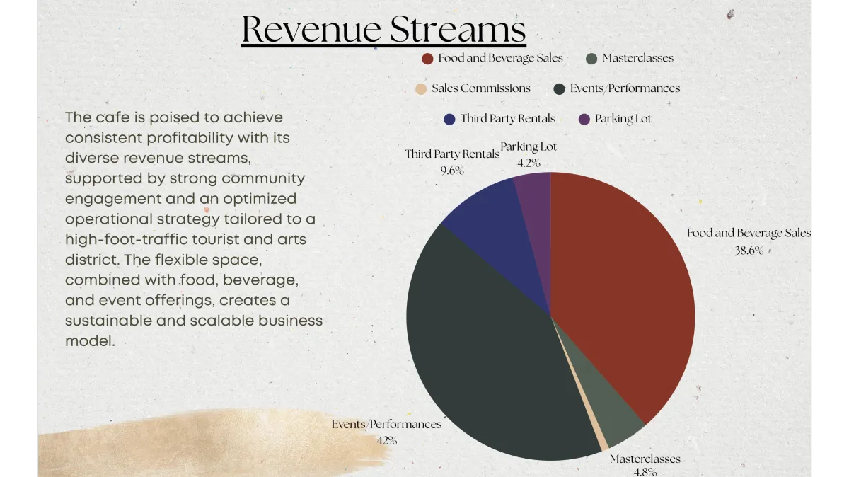 A: Multiple revenue streams ensure sustainability: daytime café/bakery sales, evening bar/restaurant sales, live events, workshops/classes, private rentals, and retail. Our founders have decades of experience making creative ventures profitable and successful.